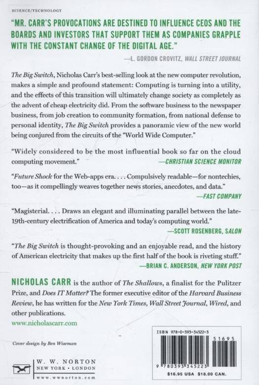 Hailed as "the most influential book so far on the cloud computing movement" (Christian Science Monitor), The Big Switch makes a simple and profound statement: Computing is turning into a utility, and the effects of this transition will ultimately change society as completely as the advent of cheap electricity did. In a new chapter for this edition that brings the story up-to-date, Nicholas Carr revisits the dramatic new world being conjured from the circuits of the "World Wide Computer."