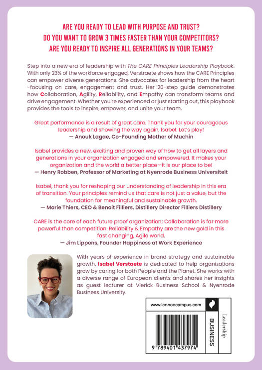 A hands-on, universally applicable leadership model. Tailored for the diverse needs of generations. Practical, real-world insights from leaders in the CARE Principles podcast The CARE Principles - Leadership Playbook leads us into the new era of leadership. This book shows us how to bridge the gap between different and diverse generations in our teams using the CARE Principles: Collaboration, Agility, Reliability, and Empathy. Through an easy 20 step process, practical tips and real-life stories from leaders like you, it breaks down how CARE can transform your team, making them perform better and feel truly engaged with your organization. The time for new leadership action is now.