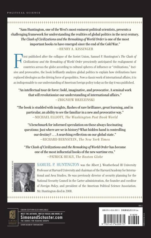 The Clash of Civilizations and the Remaking of World Order has become a classic work of international relations and one of the most influential books ever written about foreign affairs. An insightful and powerful analysis of the forces driving global politics, it is as indispensable to our understanding of American foreign policy today as the day it was published. As former National Security Adviser Zbigniew Brzezinski says in his new foreword to the book, it "has earned a place on the shelf of only about a dozen or so truly enduring works that provide the quintessential insights necessary for a broad understanding of world affairs in our time."