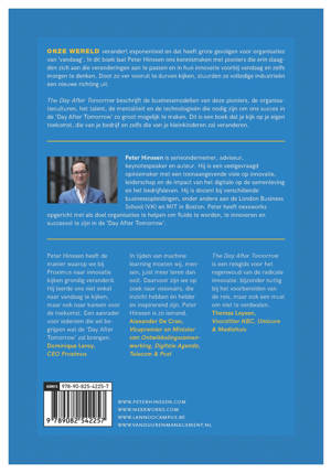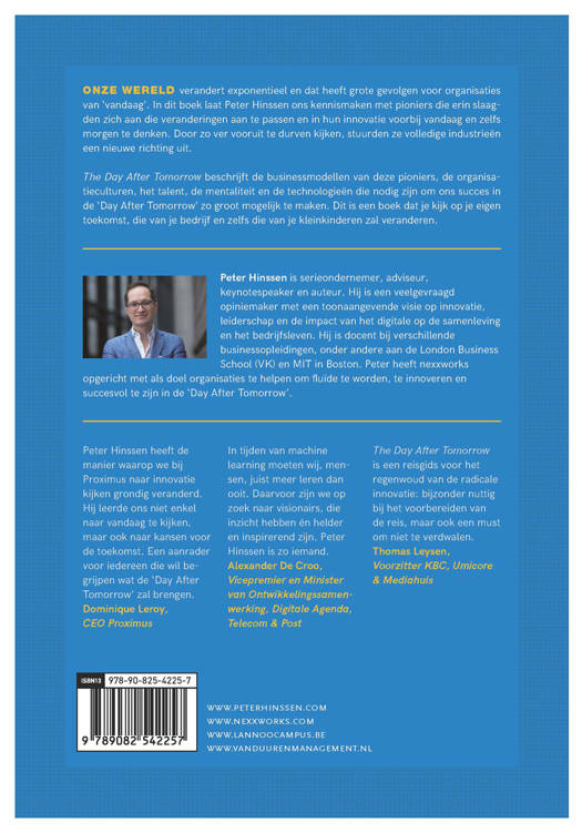Onze wereld verandert exponentieel en dat heeft grote gevolgen voor organisaties van 'vandaag'. In dit boek laat Peter Hinssen ons kennismaken met pioniers die erin slaagden zich aan die veranderingen aan te passen en in hun innovatie voorbij vandaag en zelfs morgen te denken. Door zo ver vooruit te durven kijken, stuurden ze volledige industrieën een nieuwe richting uit. The Day After Tomorrow beschrijft de businessmodellen van deze pioniers, de organisatieculturen, het talent, de mentaliteit en de technologieën die nodig zijn om ons succes in de 'Day After Tomorrow' zo groot mogelijk te maken. Dit is een boek dat je kijk op je eigen toekomst, die van je bedrijf en zelfs die van je kleinkinderen zal veranderen.
