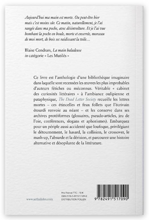 Ce livre est l'anthologie d'une bibliothèque imaginaire dans laquelle sont recensées les Åuvres les plus improbables d'auteurs fétiches ou méconnus. Véritable « Cabinet des curiosités littéraires » à l'ambiance oulipienne et pataphysique, « The Dead Letter Society » recueille les lettres mortes – ces étincelles et feux-follets que l'écrivain étourdi renvoie au néant – et les conserve dans ses archives protéiformes (glossaires, pseudo-articles, jeu de l'oie, conférence, slogans et aphorisme). Embarquez pour un périple aussi accidenté que loufoque, privilégiant le détournement, le hasard, la collision, le crossover, le mash-up, l'absurde et la dérision, et parcourez une histoire alternative et désopilante de la Littérature. À la confluence de Georges Perec, d'Enrique Vila-Matas, de Timothy McSweeney et des Monty Python.