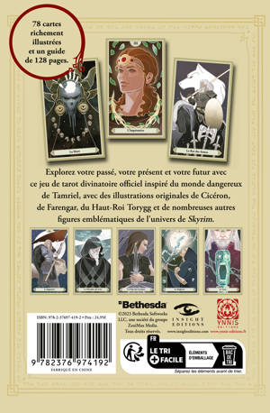 Explorez votre passé, votre présent et votre futur avec ce jeu de tarot divinatoire officiel inspiré du monde dangereux de Tamriel, avec des illustrations originales de Cicéron, de Farengar, du Haut-Roi Torygg et de nombreuses autres figures emblématiques de l’univers de Skyrim.