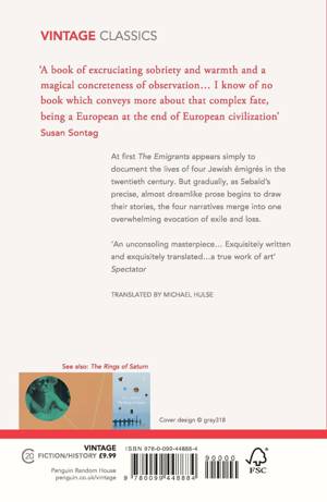 I know of no book which conveys more about that complex fate, being a European at the end of European civilization' Susan Sontag At first The Emigrants appears simply to document the lives of four Jewish émigrés in the twentieth century.