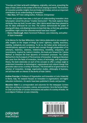 In Six Memos for the Next Millennium, Italo Calvino elaborated on six concepts or memos to offer insights on the 'shapes of things to come', which were lightness, rapidity, exactness, visibility, multiplicity and consistency. To do so, the Italian writer embraced an interdisciplinary approach to describe each concept through juxtaposition of its antonyms, heaviness, slowness, indeterminacy, invisibility, uniqueness, and inconsistency. Inspired by Calvino's intuition, this book puts forward the notion of the 'Calvino Method' to interpret the inner dynamics of innovation processes. Drawing on literature and cases from the fields of innovation, history of technology, organisation theory and corporate strategy, the book elaborates on each of the six concepts to offer a unique angle to understand innovation as technological, organisational and cultural change that generates value across a variety of domains.