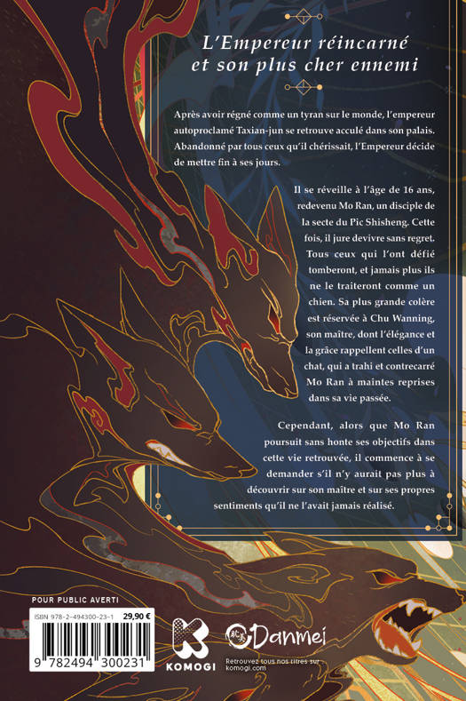 LE ROMAN DANMEI NEW YORK TIMES BESTSELLER ENFIN EN FRANCE L'Empereur réincarné et son plus cher ennemi. Après avoir régné comme un tyran sur le monde, l'empereur autoproclamé Taxian-jun se retrouve acculé dans son palais. Abandonné par tous ceux qu'il chérissait, l'Empereur décide de mettre fin à ses jours. Il se réveille à l'âge de 16 ans, redevenu Mo Ran, un disciple de la secte du Pic Shisheng. Cette fois, il jure de vivre sans regret. Tous ceux qui l'ont défié tomberont, et jamais plus ils ne le traiteront comme un chien. Sa plus grande colère est réservée à Chu Wanning, son maître, dont l'élégance et la grâce rappellent celles d'un chat, qui a trahi et contrecarré Mo Ran à maintes reprises dans sa vie passée. Cependant, alors que Mo Ran poursuit sans honte ses objectifs dans cette vie retrouvée, il commence à se demander s'il n'y aurait pas plus à découvrir sur son maître et sur ses propres sentiments qu'il ne l'avait jamais réalisé.
