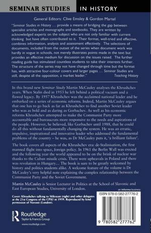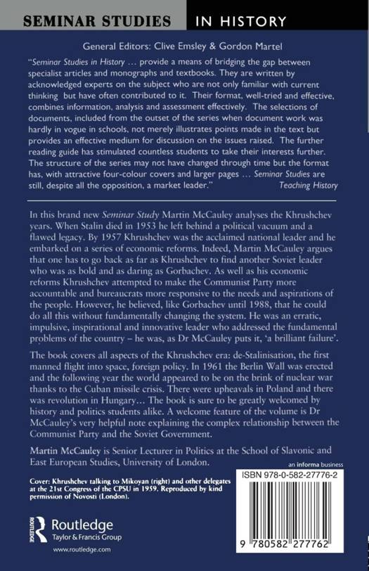 In this study all aspects of the Khrushchev era: are explored, including reforms in agriculture, economic policy, crises in Eastern Europe, the Cuban Missile Crisis of 1962, de-Stalinisation and Khrushchev's attempts to reform the Communist Party.