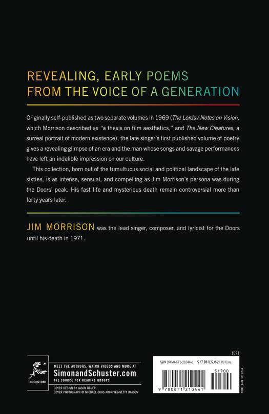 The Lords and the New Creatures, Morrison's first published volume of poetry, is an uninhibited exploration of society's dark side--drugs, sex, fame, and death--captured in sensual, seething images. Here, Morrison gives a revealing glimpse at an era and at the man whose songs and savage performances have left their indelible impression on our culture.