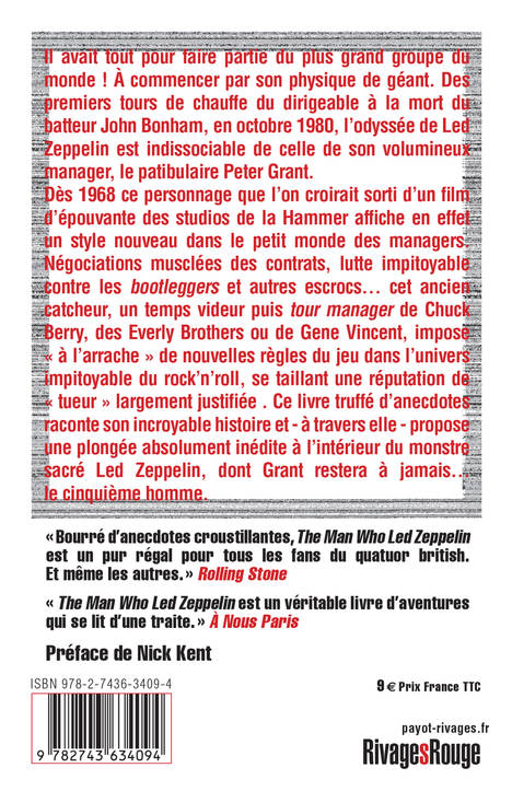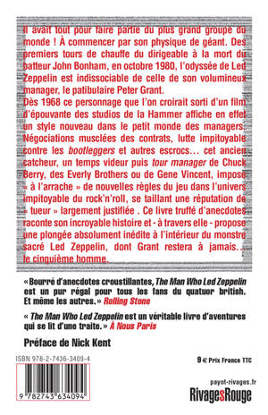 Il avait tout pour faire partie du plus grand groupe du monde ! A commencer par son physique de géant. Des premiers tours de chauffe du dirigeable à la mort du batteur John Bonham, qui marque la fin de l'aventure en octobre 1980, l'odyssée de Led Zeppelin est indissociable de celle de son volumineux manager, le patibulaire Peter Grant. Dès 1968, cet incroyable personnage affiche en effet un style nouveau dans le petit monde des managers. Négociations musclées des contrats, lutte impitoyable contre les bootleggers et autres escrocs... cet ancien catcheur, en temps tour manager de Chuck Berry, des Everly Brothers et de Gene Vincent, impose brutalement de nouvelles règles du jeu dans l'univers impitoyable du rock'n'roll, se taillant une réputation de tueur largement justifiée. Ce livre truffé d'anecdotes raconte son incroyable histoire et - à travers elle - propose une plongée inédite à l'intérieur de Led Zeppelin, dont Peter Grant restera à jamais... le cinquième homme.