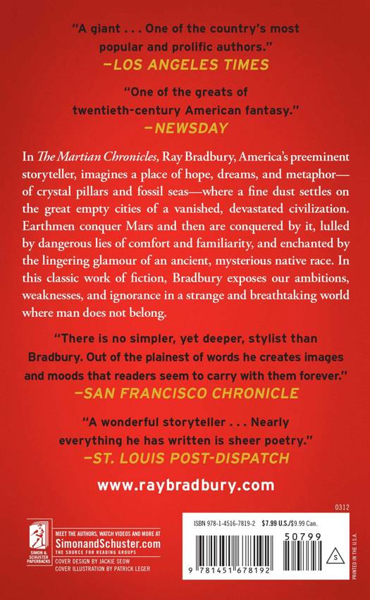 In The Martian Chronicles, Ray Bradbury, America’s preeminent storyteller, imagines a place of hope, dreams, and metaphor— of crystal pillars and fossil seas—where a fine dust settles on the great empty cities of a vanished, devastated civilization. Earthmen conquer Mars and then are conquered by it, lulled by dangerous lies of comfort and familiarity, and enchanted by the lingering glamour of an ancient, mysterious native race. In this classic work of fiction, Bradbury exposes our ambitions, weaknesses, and ignorance in a strange and breathtaking world where man does not belong.