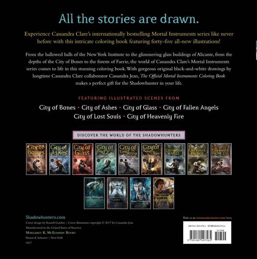 Experience Cassandra Clare's internationally bestselling world of the Shadowhunters like never before with this intricate adult coloring book featuring forty-five all-new illustrations! From the hallowed halls of the New York Institute to the glimmering glass buildings of Alicante, from the depths of the city of bones to the forests of faerie, the world of Cassandra Clare's Mortal Instruments series comes to life like never before in this stunning coloring book. The forty-five illustrations face text excerpts, highlighting never-before-illustrated scenes from The Mortal Instruments. With gorgeous original black-and-white drawings by Cassandra Jean, illustrator of