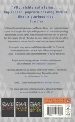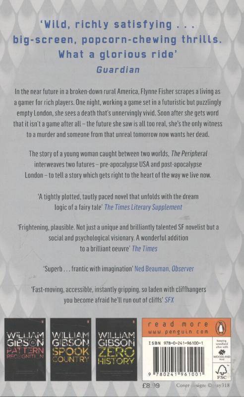 Flynne Fisher lives in rural near-future America where jobs are scarce and veterans from the wars are finding it hard to recover. She scrapes a living doing some freelance online game-playing, participating in some pretty weird stuff. Wilf Netherton lives in London, seventy-some years later, on the far side of decades of slow-motion apocalypse.
