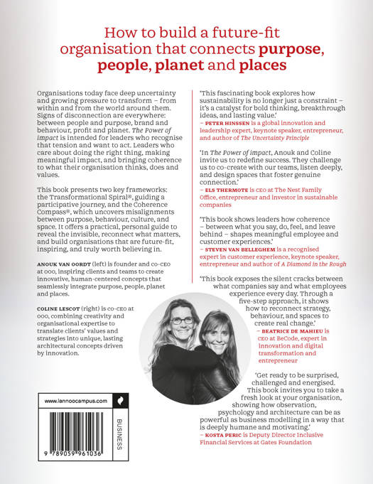 'This fascinating book explores how sustainability is no longer just a constraint - it's a catalyst for bold thinking, breakthrough ideas, and lasting value.' - PETER HINSSEN, global innovation and leadership expert, keynote speaker, entrepreneur, and author of The Uncertainty Principle 'In The Power of impact, Anouk and Coline invite us to redefine success. They challenge us to co-create with our teams, listen deeply, and design spaces that foster genuine connection.' - ELS THERMOTE, CEO at The Nest Family Office, entrepreneur and investor in sustainable companies 'This book shows leaders how coherence - between what you say, do, feel, and leave behind - shapes meaningful employee and customer experiences.' - STEVEN VAN BELLEGHEM, recognised expert in customer experience, keynote speaker, ntrepreneur and author of A Diamond In the Rough 'This book exposes the silent cracks between what companies say and what employees experience every day. Through a five-step approach, it shows how to reconnect strategy, behaviour, and spaces to create real change.' - BEATRICE DE MAHIEU, CEO at BeCode, expert in innovation and digital transformation and entrepreneur 'Get ready to be surprised, challenged and energised. This book invites you to take a fresh look at your organisation, showing how observation, psychology and architecture can be as powerful as business modelling in a way that is deeply humane and motivating.' - KOSTA PERIC, Deputy Director Inclusive Financial Services at Gates Foundation