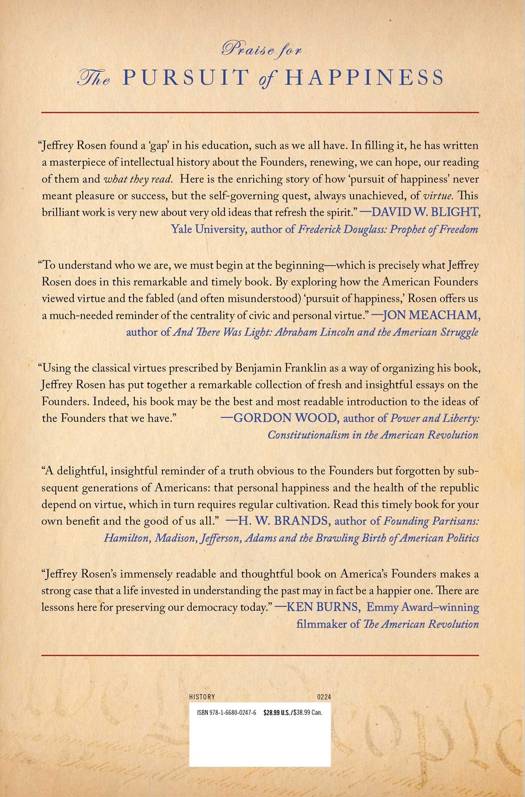 A New York Times bestseller and an "enriching...brilliant" (David W. Blight, Pulitzer Prize-winning author of Frederick Douglass) examination of what "the pursuit of happiness" meant to our nation's Founders and how that famous phrase defined their lives and became the foundation of our democracy. The Declaration of Independence identified "the pursuit of happiness" as one of our unalienable rights, along with life and liberty. Jeffrey Rosen, the president of the National Constitution Center, profiles six of the most influential founders--Benjamin Franklin, George Washington, John Adams, Thomas Jefferson, James Madison, and Alexander Hamilton--to show what pursuing happiness meant in their lives, and to give us the "best and most readable introduction to the ideas of the Founders that we have" (Gordon Wood, author of