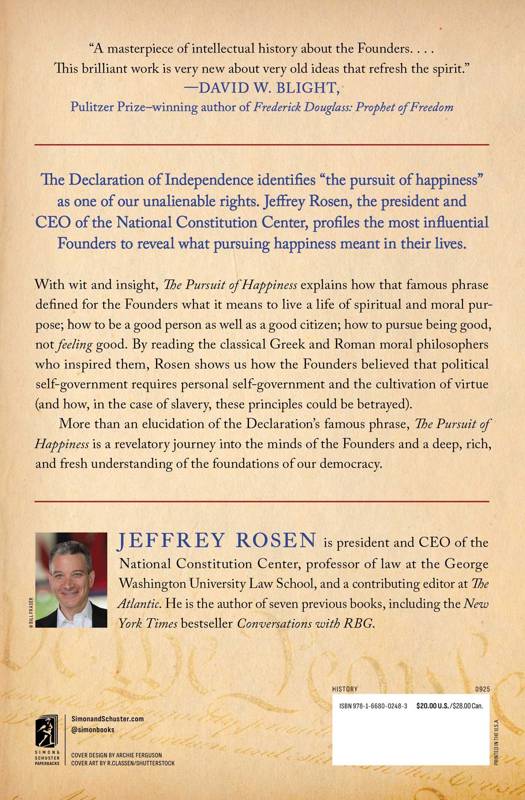 A New York Times bestseller and an "enriching...brilliant" (David W. Blight, Pulitzer Prize-winning author of Frederick Douglass) examination of what "the pursuit of happiness" meant to our nation's Founders and how that famous phrase defined their lives and became the foundation of our democracy. The Declaration of Independence identified "the pursuit of happiness" as one of our unalienable rights, along with life and liberty. Jeffrey Rosen, the president of the National Constitution Center, profiles six of the most influential founders--Benjamin Franklin, George Washington, John Adams, Thomas Jefferson, James Madison, and Alexander Hamilton--to show what pursuing happiness meant in their lives, and to give us the "best and most readable introduction to the ideas of the Founders that we have" (Gordon Wood, author of