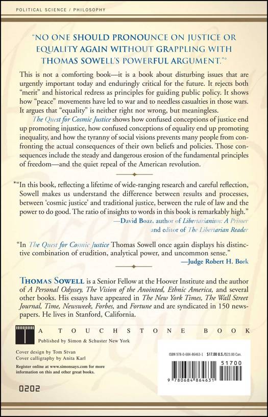 This is not a comforting book -- it is a book about disturbing issues that are urgently important today and enduringly critical for the future. It rejects both "merit" and historical redress as principles for guiding public policy. It shows how "peace" movements have led to war and to needless casualties in those wars. It argues that "equality" is neither right nor wrong, but meaningless. The Quest for Cosmic Justice shows how confused conceptions of justice end up promoting injustice, how confused conceptions of equality end up promoting inequality, and how the tyranny of social visions prevents many people from confronting the actual consequences of their own beliefs and policies. Those consequences include the steady and dangerous erosion of the fundamental principles of freedom -- and the quiet repeal of the American revolution.