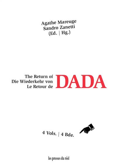 Cet ouvrage retrace le processus de (ré-)invention de Dada notamment dans les années 1950 et 1960, entre autres par ses acteurs même, et étudie dans quelle mesure les impulsions données par Dada sont encore pertinentes pour l'analyse et les débats esthétiques, littéraires et culturels d'aujourd'hui. Plus que de simples actes de colloque, la publication, structurée en quatre volumes (Filiations, Expositions, Traces et Historiographies), est augmentée de nombreux documents (listes d'exposition, de publications, entretiens) ainsi que de certaines contributions ultérieures au colloque. Publié suite au colloque international éponyme organisé par Agathe Mareuge et Sandro Zanetti au Cabaret Voltaire, Zurich, en 2016, à l'occasion du centenaire de Dada.