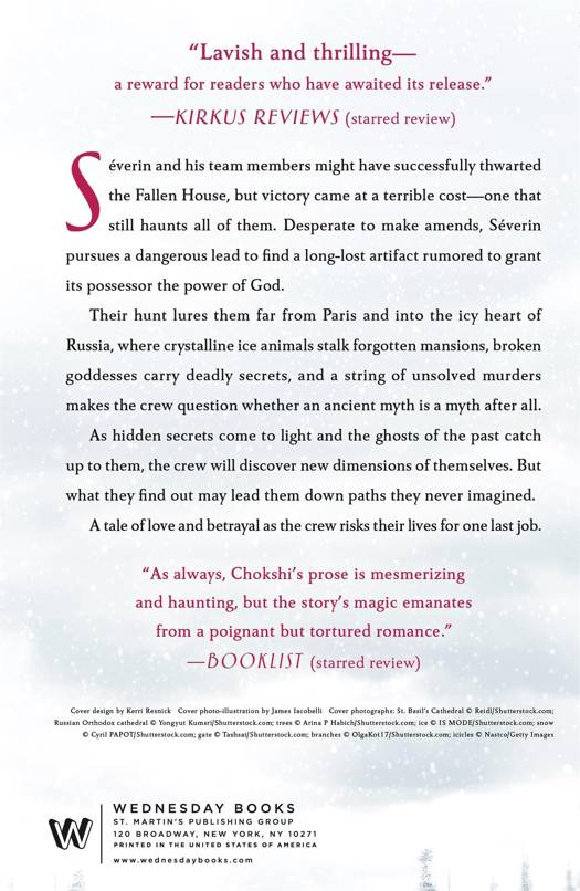 They are each other's fiercest love, greatest danger, and only hope. Séverin and his team members might have successfully thwarted the Fallen House, but victory came at a terrible cost--one that still haunts all of them. Desperate to make amends, Séverin pursues a dangerous lead to find a long lost artifact rumored to grant its possessor the power of God. Their hunt lures them far from Paris and into the icy heart of Russia, where crystalline ice animals stalk forgotten mansions, broken goddesses carry deadly secrets, and a string of unsolved murders makes the crew question whether an ancient myth is a myth after all. As hidden secrets come to the light and the ghosts of the past catch up to them, the crew will discover new dimensions of themselves. But what they find out may lead them down paths they never imagined. A tale of love and betrayal as the crew risks their lives for one last job.Nous publions uniquement les avis qui respectent les conditions requises. Consultez nos conditions pour les avis.