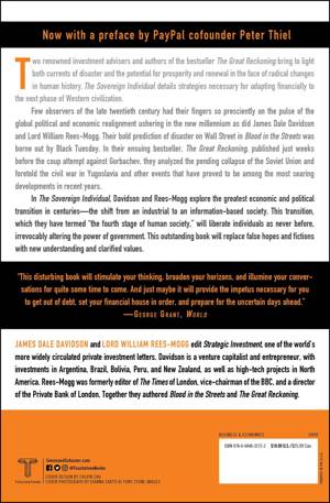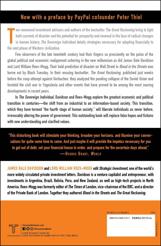 Two renowned investment advisors and authors of the bestseller The Great Reckoning bring to light both currents of disaster and the potential for prosperity and renewal in the face of radical changes in human history as we move into the next century. The Sovereign Individual details strategies necessary for adapting financially to the next phase of Western civilization. Few observers of the late twentieth century have their fingers so presciently on the pulse of the global political and economic realignment ushering in the new millennium as do James Dale Davidson and Lord William Rees-Mogg. Their bold prediction of disaster on Wall Street in Blood in the Streets was borne out by Black Tuesday. In their ensuing bestsellar, The Great Reckoning, published just weeks before the coup attempt against Gorbachev, they analyzed the pending collapse of the Soviet Union and foretold the civil war in Yugoslavia and other events that have proved to be among the most searing developments of the past few years. In The Sovereign Individual, Davidson and Rees-Mogg explore the greatest economic and political transition in centuries -- the shift from an industrial to an information-based society. This transition, which they have termed "the fourth stage of human society," will liberate individuals as never before, irrevocably altering the power of government. This outstanding book will replace false hopes and fictions with new understanding and clarified values.