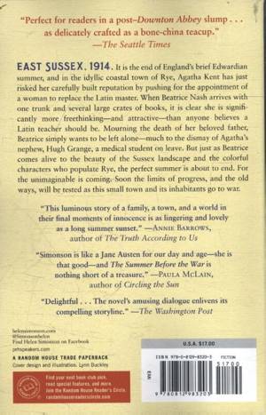 NAMED ONE OF THE BEST BOOKS OF THE YEAR BY THE WASHINGTON POST AND NPR East Sussex, 1914. It is the end of England's brief Edwardian summer, and everyone agrees that the weather has never been so beautiful. Hugh Grange, down from his medical studies, is visiting his Aunt Agatha, who lives with her husband in the small, idyllic coastal town of Rye. Agatha's husband works in the Foreign Office, and she is certain he will ensure that the recent saber rattling over the Balkans won't come to anything. And Agatha has more immediate concerns; she has just risked her carefully built reputation by pushing for the appointment of a woman to replace the Latin master.