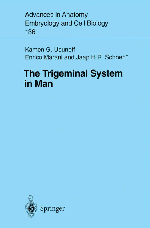 This monograph offers a comprehensive review of present knowledge of the structure and connections of the trigeminal nuclei in humans, and compares it to laboratory animal findings. The authors provide cytoarchitectural data from their own research, and trace trigeminal pathways in human material by means of the Nauta technique. In humans the trigeminal nuclear complex includes the motor nucleus, the principal sensory (pontine) nucleus, the spinal nucleus (subdivided into oral, interpolar and caudal nuclei), and the mesencephalic nucleus and several small nuclei. The supratrigeminal nucleus, as described in various mammals, is not defined in the human brain. The primary afferents to all subdivisions of the trigeminal nuclear complex in humans appear to be entirely ipsilateral. Some of the 'extratrigeminal' primary afferents described in experimental animals are also present in the human brain and the nucleus ovalis receives primary and possibly secondary afferents from the trigeminal systems. A significant difference between the human trigeminal system and the subprimate species is seen in the monosynaptic cortical projection to the motor trigeminal nucleus.