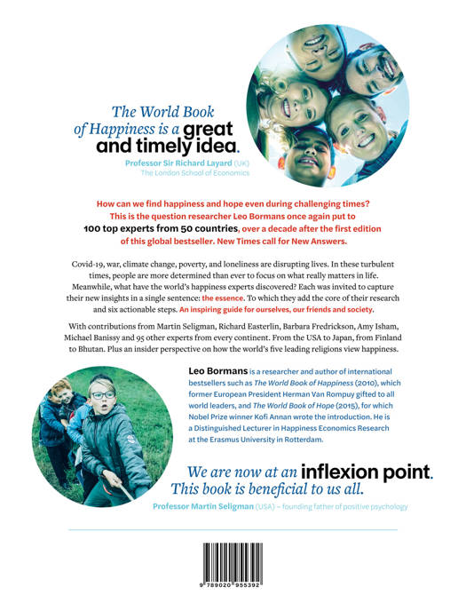 The virus, the war, the climate, inflation, poverty and loneliness make people feel insecure. In these troubled times, there is more interest than ever for what is truly important in life: happiness, hope and love. What does science teach us today? Are we still allowed to strive towards happiness? And how do we do that? Leo Bormans asked the same question over and over again to a hundred professors all over the world: established names and young up-and-comers. Every scientist briefly summarizes their recent research after which they formulate their insights in one single sentence: the essence. To this they link at least three concrete pieces of advice: for our own lives, for our friends and for society. With contributions from the most prominent experts in positive psychology, such as: Prof. Martin Seligman (University of Pennsylvania), author of more than 20 international bestsellers and the founding father of positive psychology; Richard Easterlin (University of Southern California), one of the most respected and renowned authorities in happiness research, Prof. Sir Richard Layard (The London School of Economics), one of the most influential voices in the global study of happiness and well-being.