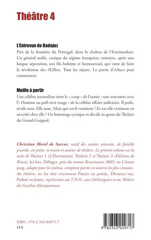L'entrevue de Badajoz : Près de la frontière du Portugal, dans la chaleur de l'Estrémadure. Un général noble, cacique du régime franquiste, retrouve, après une longue séparation, son fils bohème et homosexuel, qui vient de faire la révolution des illets. Tout les sépare. La partie d'échecs peut commencer. Maille à partir : Une célèbre journaliste tient le "coup" de l'année : une rencontre l'"Homme au pull-over rouge" de la célèbre affaire judiciaire. Il parle, révèle tout. Elle note. Mais qui est-il vraiment ? Un hommage cynique et décalé au genre Théâtre du Grand-Guignol.
