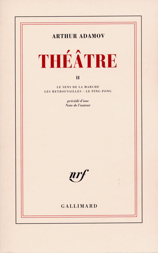 Ce second tome du théâtre d'Arthur Adamov comprend deux parties d'inégale importance : d'une part, Le Sens de la Marche et Les Retrouvailles, qui relèvent encore de ce qu'on peut appeler la première manière d'Adamov, où les motifs apparemment les plus simples de la vie quotidienne apparaissent comme les signes d'un univers voué à la terreur ; d'autre part, Le Ping-Pong, qui annonce un véritable renouvellement de sa dramaturgie. Dans Le Ping-Pong, en effet, si toute l'action tourne autour d'un appareil à sous, cet appareil ne se transforme pas en agent de la Fatalité, et Arthur, Victor, Annette, Sutter, etc., n'en deviennent pas pour autant schématiques ; ils témoignent tous, chacun à un stade différent, de la réalité sociale. Ainsi le théâtre d'Arthur Adamov acquiert-il une nouvelle vigueur, passant de La Parodie à ce qui pourrait bien être la comédie de notre temps.