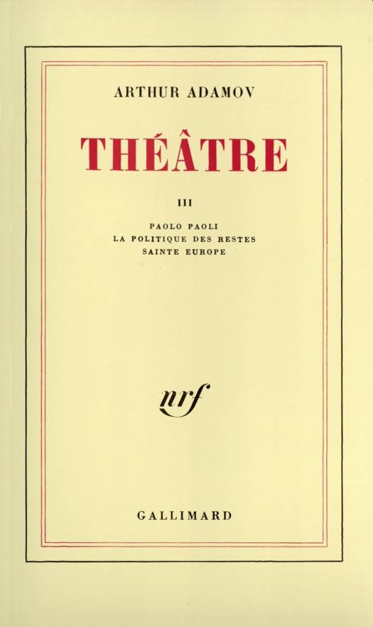 De Paolo Paoli à Sainte Europe, en passant par La Politique des restes, Arthur Adamov poursuit l'évolution amorcée dès Le Ping-Pong, en esquissant une large tragi-comédie de la vie sociale. Ces trois pièces, pourtant fort dissemblables, ont un thème commun : celui du trafic, un trafic qui n'est pas seulement l'échange des biens, mais encore l'échange des sentiments, même les plus intimes. Ainsi la réalité est abordée sous ses deux faces : celle des grands conflits historiques comme la guerre de 14-18, la politique raciste en Afrique du Sud, le partage des influences et des intérêts dans le tiers monde ... et celle aussi des solitudes et des névroses individuelles qui, comme l'ont bien montré Frantz Fanon et Danilo Dolci, tout en étant le produit d'une évolution historique, empêchent les hommes de faire leur propre histoire. Mais, si la succession de ces trois pièces apparaît logique, chacune d'elles possède un ton qui lui est propre. Alors que dans Paolo Paoli Arthur Adamov s'attache à décrire minutieusement la situation d'un petit monde clos - qui renvoie d'ailleurs à toute l'histoire de l'époque -, dans Sainte Europe il enjambe allégrement plusieurs siècles et fait interférer la vie publique avec l'existence la plus secrète, celle de nos songes, pour créer une satire à la mesure de notre temps.