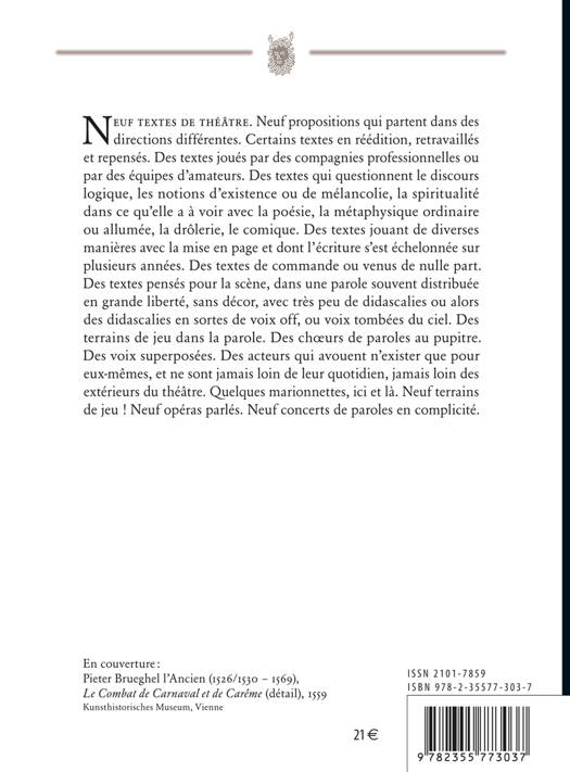 9 textes de théâtre qui questionnent le discours logique, les notions d’existence ou de mélancolie, la spiritualité dans ce qu’elle a à voir avec la poésie, la métaphysique ordinaire ou allumée, la drôlerie, le comique. Des textes pensés pour la scène, dans une parole souvent distribuée en grande liberté, sans décor. Des terrains de jeu dans la parole. Des chœurs de paroles au pupitre. Des voix superposées. Des acteurs qui avouent n’exister que pour eux-mêmes, et ne sont jamais loin de leur quotidien, jamais loin des extérieurs du théâtre. Quelques marionnettes, ici et là.Grand bonheur / de vous savoir exister -Texte inéditSous la lumière d'Assise - Éditions Voix, 2000La Conteuse et son Roi nu -Texte inéditTRYPTIQUELa Compagnie des A(r)mateurs - Texte inéditLa ligne de partage des rêves - Texte inéditMélancolie douce - Prix Jean-Jacques Lerrant - La Rumeur Libre éditions, 2013 (épuisé).POUR GUIGNOL Écrits à partir de manuscrits de la fin du XIXièmeLes asticots du futur - inéditTrouver le bon mot - inéditLe concours de beauté - inédit