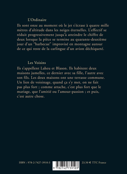 Ils sont onze au moment où le jet s'écrase à quatre mille mètres d'altitude dans les neiges éternelles. L'effectif se réduit progressivement jusqu'à atteindre le chiffre de deux lorsque la pièce se termine au quarante-deuxième jour d'un "barbecue" improvisé en montagne autour