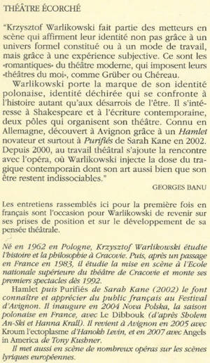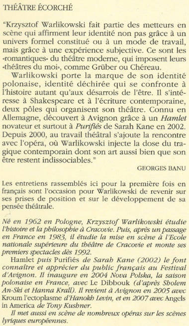 "Krzysztof Warlikowski fait partie des metteurs en scène qui affirment leur identité non pas grâce à un univers formel constitué ou à un mode de travail, mais grâce à une expérience subjective. Ce sont les "romantiques" du théâtre moderne, qui imposent leurs "théâtre du moi", comme Grüber ou Chéreau. Warlikowski porte la marque de son identité polonaise, identité déchirée qui se confronte à l'histoire autant qu'aux désarrois de l'être. Il s'intéresse à Shakespeare et à l'écriture contemporaine, deux pôles qui organisent son théâtre. Connu en Allemagne, découvert à Avignon grâce à un «Hamlet »novateur et surtout à «Purifiés» de Sarah Kane en 2002. Depuis 2000, au travail théâtral s'ajoute la rencontre avec l'opéra, où Warlikowski injecte la dose du tragique contemporain dont son art aussi bien que son être restent indissociables."