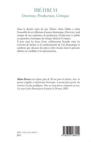 Dans le dernier tome de son Théâtre, Alain Didier a réuni l'ensemble de ses réflexions d'auteur dramatique (Doctrine), rend compte de son expérience de producteur (Production) et publie ses premières chroniques de critique théâtral (Critique). Il jette ainsi les bases d'une collaboration féconde entre les écrivains de théâtre et les professionnels de l'art dramatique et confirme que chacune des pièces enfin réunies dans la présente édition est candidate à la représentation.