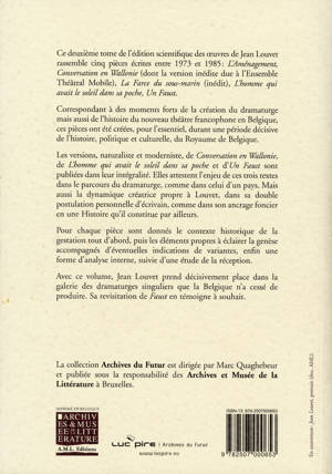 Ce deuxième tome rassemble cinq pièces écrites entre 1973 et 1985, dont un inédit absolu La Farce du sous-marin. Correspondant à des moments forts de la création du dramaturge mais aussi de l’histoire du nouveau théâtre francophone en Belgique, elles sont créées, pour l’essentiel durant une période décisive de l’histoire, politique et culturelle, du royaume de Belgique.