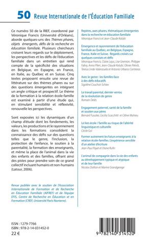 Ce numéro 50 de la RIEF, coordonné par Véronique Francis (Université d'Orléans), aborde quelques-uns des Thèmes phares, objets émergents, défis de la recherche en éducation familiale. Plusieurs chercheurs croisent leurs regards sur le déploiement, les perspectives et les défis de l'éducation familiale dans un entretien qui rend compte de la spécificité des situations en Belgique, en Espagne, en France, en Italie, au Québec et en Suisse. Cinq textes proposent ensuite une revue de littérature sur des thèmes phares ou sur des questions émergentes en intégrant un angle critique et prospectif. Le thème de la formation à la relation école-famille est examiné à partir d'une étude qui, en stimulant sensibilité et réflexivité, renouvelle les perspectives. Sont exposées ici les dynamiques d'un champ d'étude dont les fondements, les valeurs, les productions et le rayonnement dans les formations consolident la connaissance des défis sur des questions telles que le genre, l'inclusion, la protection de l'enfance, le soutien à la parentalité, la formation des enseignants, et même la place de l'animal dans la vie des enfants et des familles, offrant ainsi des pistes pour prendre soin de ce grand collectif incluant humains et non-humains (Latour, 2006).