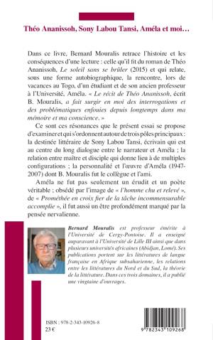 Dans ce livre, Bernard Mouralis retrace l'histoire et les conséquences d'une lecture : celle qu'il fit du roman de Théo Ananissoh, "Le soleil sans se brûler" (2015) et qui relate la rencontre d'un étudiant et de son ancien professeur d'université, Améla. Ce roman a fait surgir, chez Bernard Mouralis, « des interrogations et des problématiques enfouies depuis longtemps » dans sa « mémoire » et dans sa « conscience ». Ce sont ces résonnances que le présent essai se propose d'examiner autour de trois pôles : la destinée littéraire d'un écrivain au centre du dialogue ; la relation entre maître et disciple ; et le parcours d'Améla, dont Bernard Mouralis fut le collègue et l'ami.