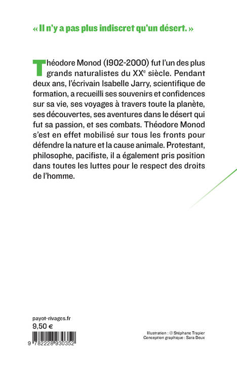 Théodore Monod (1902-2000) appartient à cette génération de chercheurs du Muséum national d'histoire naturelle dont la vocation a été, durant toute leur vie, de parcourir la planète, d'en observer et d'en inventorier les richesses, à l'image des encyclopédistes du XVIIIe siècle. Grand défenseur de la nature, il s'est mobilisé sur tous les fronts pour sa conservation. Protestant, philosophe, pacifiste, il a pris position dans toutes les luttes pour le respect des droits de l'homme.