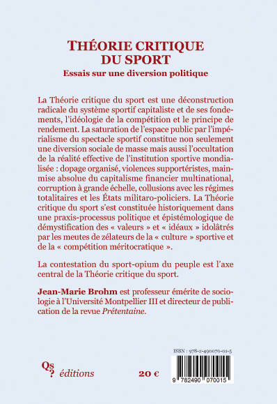 La Théorie critique du sport est une déconstruction radicale du système sportif capitaliste et de ses fondements, l’idéologie de la compétition et le principe de rendement. La saturation de l’espace public par l’impérialisme du spectacle sportif constitue non seulement une diversion sociale de masse mais aussi l’occultation de la réalité effective de l’institution sportive mondialisée : dopage organisé, violences supportéristes, main-mise absolue du capitalisme financier multinational, corruption à grande échelle, collusions avec les régimes totalitaires et les états militaro-policiers. La Théorie critique du sport s’est constituée historiquement dans une praxis-processus politique et épistémologique de démystification des « valeurs » et « idéaux » idolâtrés par les meutes de zélateurs de la « culture » sportive et de la « compétition méritocratique ». La contestation du sport-opium du peuple est l’axe central de la Théorie critique du sport.
