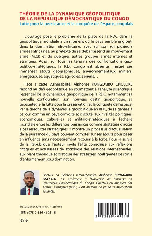 L'ouvrage pose le problème de la place de la RDC dans la géopolitique mondiale à un moment où le pays semble englouti dans la domination afro-africaine, avec sur son sol plusieurs armées africaines, au prétexte de se débarrasser d'un mouvement armé (M23) et de quelques autres groupes armés internes et étrangers. Aussi, sur tous les terrains des confrontations géo-politico-stratégiques, la R.D. Congo est absente, malgré ses immenses atouts géographiques, environnementaux, miniers, énergétiques, aquatiques, agricoles, aériens... Face à cette vulnérabilité, Alphonse PONGOMBO ONOLOKE répond au défi géopolitique en soumettant à l'analyse scientifique l'essentiel de la dynamique géopolitique de la RDC, notamment sa nouvelle configuration, son nouveau destin géopolitique, sa géostratégie, la lutte pour la préservation et la conquête de l'espace. Par la théorie de la dynamique géopolitique en RDC, de sa genèse à ce jour comme un pays convoité et disputé, aux rivalités politiques, économiques, culturelles et militaro-stratégiques à l'échelle mondiale entre les différentes puissances comme stratégies d'accès à ces ressources stratégiques, il montre un processus d'actualisation de la puissance du pays pouvant compter sur ses atouts pour peser en influence sans nécessairement recourir à la force. Pour la survie de la République, l'auteur invite l'élite congolaise aux réflexions critiques et actualisées de sociologie des relations internationales, aux plans théorique et pratique des stratégies intelligentes de sortie d'enfermement sous domination.