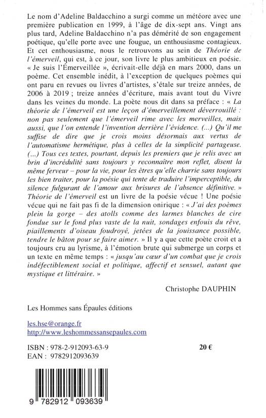 Le nom d’Adeline Baldacchino a surgi comme un météore avec une première publication en 1999, à l’âge de dix-sept ans. Vingt ans plus tard, Adeline Baldacchino n’a pas démérité de son engagement poétique, qu’elle porte avec une fougue, un enthousiasme contagieux. Et cet enthousiasme, nous le retrouvons au sein de Théorie de l’émerveil, qui est, à ce jour, son livre le plus ambitieux en poésie.