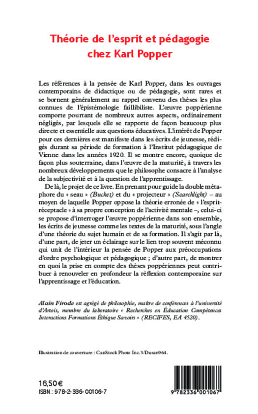 Ce livre se propose d'interroger l'oeuvre popérienne dans son ensemble, les écrits de jeunesse comme les textes de la maturité, sous l'angle d'une théorie du sujet humain et de sa formation. Il s'agit, d'une part, de jeter un éclairage sur le lien qui unit de l'intérieur la pensée de Popper aux préoccupations d'ordre psychologique et pédagogique; d'autre part, de montrer en quoi la prise en compte des thèses popériennes peut contribuer à renouveler la réflexion contemporaine sur l'apprentissage et l'éducation.