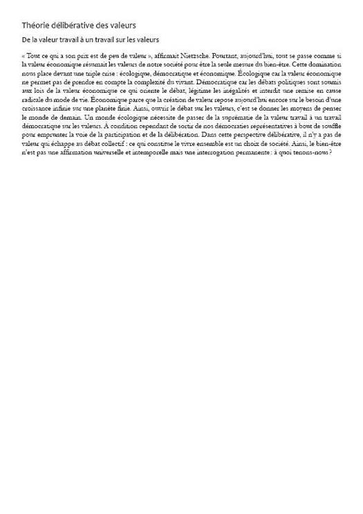 « Tout ce qui a son prix est de peu de valeur », affirmait Nietzsche. Pourtant, aujourd’hui, tout se passe comme si la valeur économique résumait les valeurs de notre société pour être la seule mesure du bien-être. Cette domination nous place devant une triple crise : écologique, démocratique et économique. Écologique car la valeur économique ne permet pas de prendre en compte la complexité du vivant. Démocratique car les débats politiques sont soumis aux lois de la valeur économique ce qui oriente le débat, légitime les inégalités et interdit une remise en cause radicale du mode de vie. Économique parce que la création de valeur repose aujourd’hui encore sur le besoin d’une croissance infinie sur une planète finie. Ainsi, ouvrir le débat sur les valeurs, c’est se donner les moyens de penser le monde de demain. Un monde écologique nécessite de passer de la suprématie de la valeur travail à un travail démocratique sur les valeurs. À condition cependant de sortir de nos démocraties représentatives à bout de souffle pour emprunter la voie de la participation et de la délibération. Dans cette perspective délibérative, il n’y a pas de valeur qui échappe au débat collectif : ce qui constitue le vivre ensemble est un choix de société. Ainsi, le bien-être n’est pas une affirmation universelle et intemporelle mais une interrogation permanente : à quoi tenons-nous ?