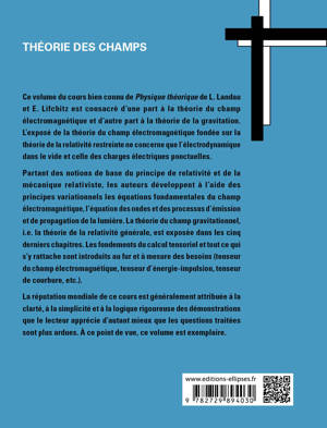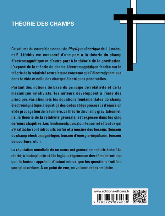 Ce volume du cours bien connu de Physique théorique de L. Landau et E. Lifchitz est consacré d’une part à la théorie du champ électromagnétique et d’autre part à la théorie de la gravitation. L’exposé de la théorie du champ électromagnétique fondée sur la théorie de la relativité restreinte ne concerne que l’électrodynamique dans le vide et celle des charges électriques ponctuelles.