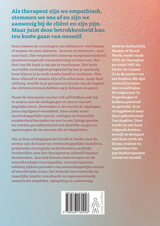 Om al deze uitdagingen het hoofd te bieden laat de auteur aan de hand van wetenschappelijke inzichten, praktische strategieën en herkenbare praktijkvoorbeelden zien hoe therapeuten zichzelf kunnen beschermen. Aan bod komen onderwerpen als de neurofysiologie van empathie, arousalregulatie, zelfzorg tijdens periodes van maatschappelijke onrust of wereldwijde crises, het behoud van evenwicht en innerlijke kracht, overdracht en tegenoverdracht, somatische empathie, spiegeling en nabootsing.