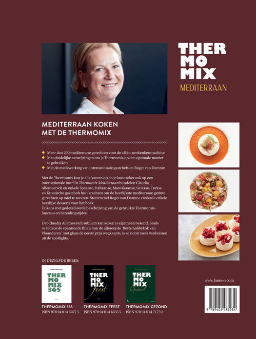 - Met de medewerking van internationale gastchefs en Roger van Damme Met de Thermomix kun je alle kanten op en je kunt zeker ook op een internationale tour! In Thermomix Mediterraan bundelen Claudia Allemeersch en enkele Spaanse, Italiaanse, Marokkaanse, Griekse, Turkse en Kroatische gastchefs hun krachten om de heerlijkste mediterraan getinte gerechten op tafel te toveren. Sterrenchef Roger van Damme creëerde enkele heerlijke desserts voor het boek. Telkens met gedetailleerde beschrijving van de gebruikte Thermomixfuncties en bereidingstijden.