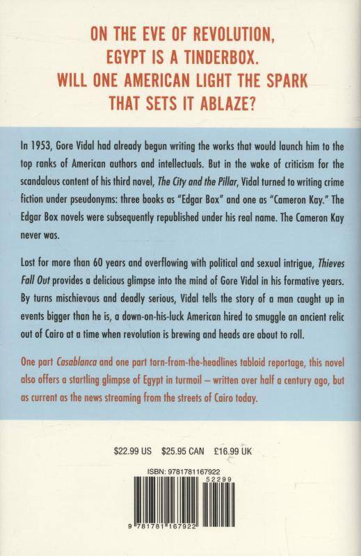 Thieves Fall Out provides a delicious glimpse into the mind of Gore Vidal in his formative years. By turns mischievous and deadly serious, Vidal tells the story of a man caught up in events bigger than he is, a down-on-his-luck American hired to smuggle an ancient relic out of Cairo at a time when revolution is brewing and heads are about to roll.