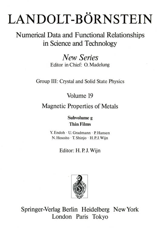 Volume 19 of Group III (Crystal and Solid State Physics) deals with the magnetic properties of metals, alloys and metallic compounds. The amount of information available in this field is so substantial that several subvolumes are needed to cover it all. The first subvolumes treat the intrinsic magnetic properties, i. e. those magnetic properties which depend only on the chemical composition and the crystal structure. So far, subvolumes III/19a, III/19b and III/19c have appeared. Data on the properties that depend on the preparation of the samples measured, as for instance, thin films or amorphous alloys and the magnetic alloys used in technical applications, are being compiled in the last subvolumes of III/19. In the first of these, subvolume III/19g, magnetic properties are given for several major types of crystalline and amorphous thin magnetic films that are supported by a substrate and for which a more or less coherent group of data is available. The properties of sputtered metallic amorphous films containing 3d transition elements will be dealt with in the following subvolume.