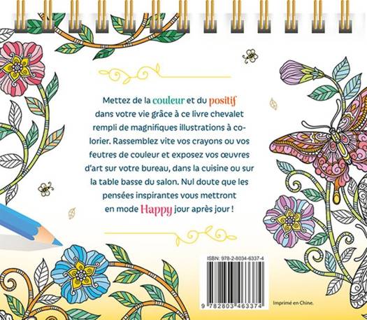 Mettez de la couleur et du positif dans votre vie grâce à ce livre chevalet rempli de magnifiques illustrations à colorier. Rassemblez vite vos crayons ou vos feutres de couleur et exposez vos oeuvres d'art sur votre bureau, dans la cuisine ou sur la table basse du salon. Nul doute que les pensées inspirantes vous mettront en mode HAPPY jour après jour !