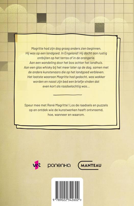 Magritte had zijn dag graag anders zien beginnen.Hij was op een landgoed. In Engeland! Hij dacht aan rustig ontbijten op het terras of in de orangerie.Aan een wandeling door het bos achter het landhuis.Aan een glas whisky bij het meer later op de dag, samen met de andere kunstenaars die op het landgoed verbleven.Het laatste waaraan Magritte had gedacht, was wakker worden en naast zijn bed een briefje vinden dat even kort als raadselachtig was... Speur mee met René Magritte! Los de raadsels en puzzels op en ontdek wie de kunstwerken heeft ontvreemd, hoe, wanneer en waarom.