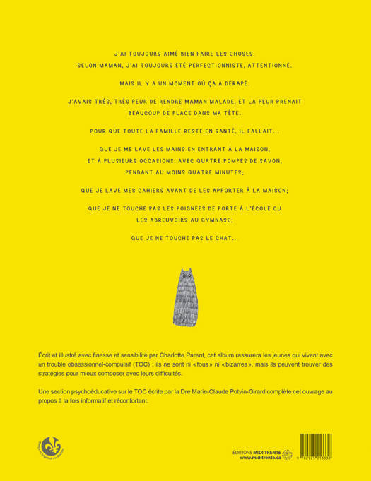J’ai toujours aimé bien faire les choses. Selon maman, j’ai toujours été perfectionniste, attentionné. Mais il y a un moment où ça a dérapé. Ma mère était enceinte et, comme j’avais très, très peur de la rendre malade, la peur prenait beaucoup de place dans ma tête. Pour que toute la famille reste en santé, il fallait... que je me lave les mains en entrant à la maison, et à plusieurs occasions, avec quatre pompes de savon, pendant au moins quatre minutes ; que je lave mes cahiers avant de les rentrer dans la maison ; que j’utilise des ustensiles de la maison à la cafétéria ; que je ne touche pas les poignées de porte à l’école ou les abreuvoirs au gymnase ; que j’évite d’aller à la toilette à l’école ; que je ne touche pas le chat... Écrit et illustré avec finesse et sensibilité par Charlotte Parent, cet album rassurera les jeunes qui vivent avec un trouble obsessionnel-compulsif (TOC) : ils ne sont ni « fous » ni « bizarres », mais ils peuvent trouver des stratégies pour mieux composer avec leurs difficultés.