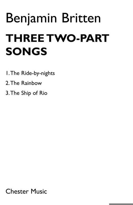 (Choral). 1. The Ride-by-nights 2. The Rainbow 3. The Ship of Rio for boys' or girls'/women's voices and piano Texts: Walter de la Mare Publisher: Chester Music Difficulty level: 1 These are three lovely songs making a really delightful set in a concert programme. They were originally called Three Studies in Canon and that says all that needs to be said about how these pieces are structured. Britten loved writing in canon and seemed to tease out the fun of having voices leading and following each other. Remember that fabulous three-part canon in the Ceremony of Carols: This little babe as one of the most brilliant examples. These pieces are very straightforward for all participants - piano and voices and are ideal material for schools or for upper voice choirs looking for original material which lights a special touch paper. Duration: 6 minutes Paul Spicer, Lichfield, 2011